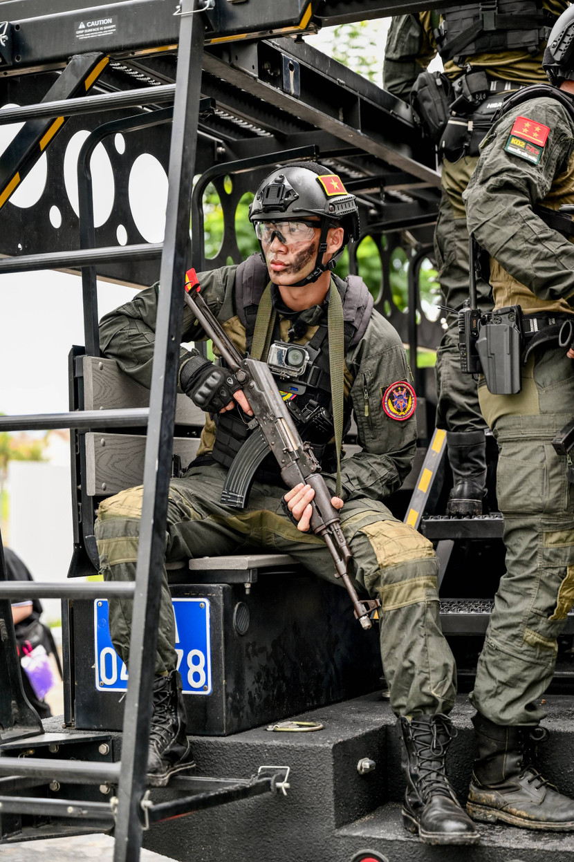 Không còn chỗ cho sự do dự, tất cả nhanh chóng trang bị súng ngắn, súng AK, áo giáp, băng đạn, lớp ngụy trang và bước lên xe bọc thép trong tâm thế sẵn sàng xuất trận. Song Luân rạng rỡ chia sẻ: “Được ngồi trên chiếc xe bọc thép của lực lượng CAND, đó là một cảm giác oai phong lẫm liệt, anh hùng lắm. Giống như trong những bộ phim bom tấn vậy”. Đội hình hôm nay càng thêm đặc biệt với sự đồng hành của đội cảnh khuyển - những “chiến binh bốn chân” trung thành và quả cảm.