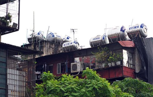 Bể lớn chồng bể nhỏ trên nóc nhà xuống cấp