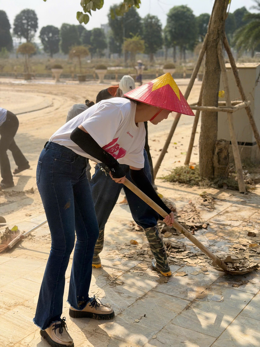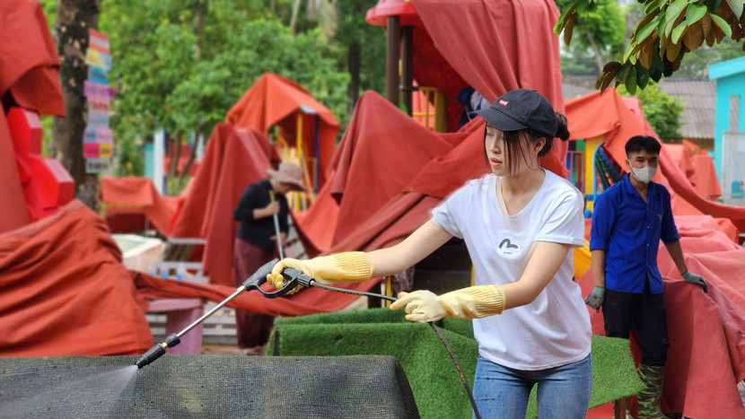 | CEO Phạm Kim Dung cùng dàn hoa hậu, á hậu và nam vương đã có mặt tại tỉnh Thái Nguyên tham gia dọn dẹp bùn đất, vệ sinh trường học và khắc phục hậu quả sau cơn bão |