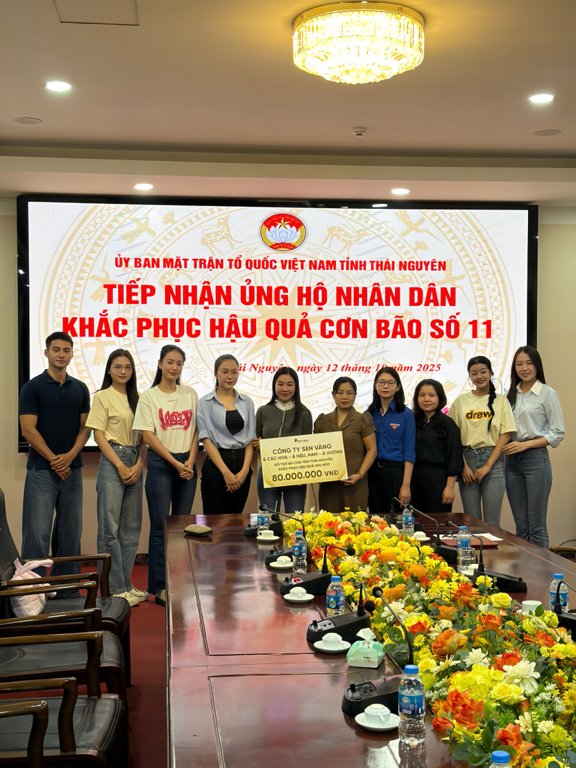 Tại Uỷ ban Mặt trận Tổ quốc Việt Nam tỉnh Thái Nguyên, Sen Vàng và các hoa - á hậu, nam - á vương trao tặng 80 triệu đồng giúp đỡ người dân tỉnh Thái Nguyên. Á hậu Lê Thị Thu Trà cũng trích 30 triệu đồng từ phần thưởng cô nhận được sau cuộc thi Miss Grand Vietnam 2025. Á hậu Đỗ Thị Phương Thanh cùng người thân, bạn bè ủng hộ 20 triệu đồng.