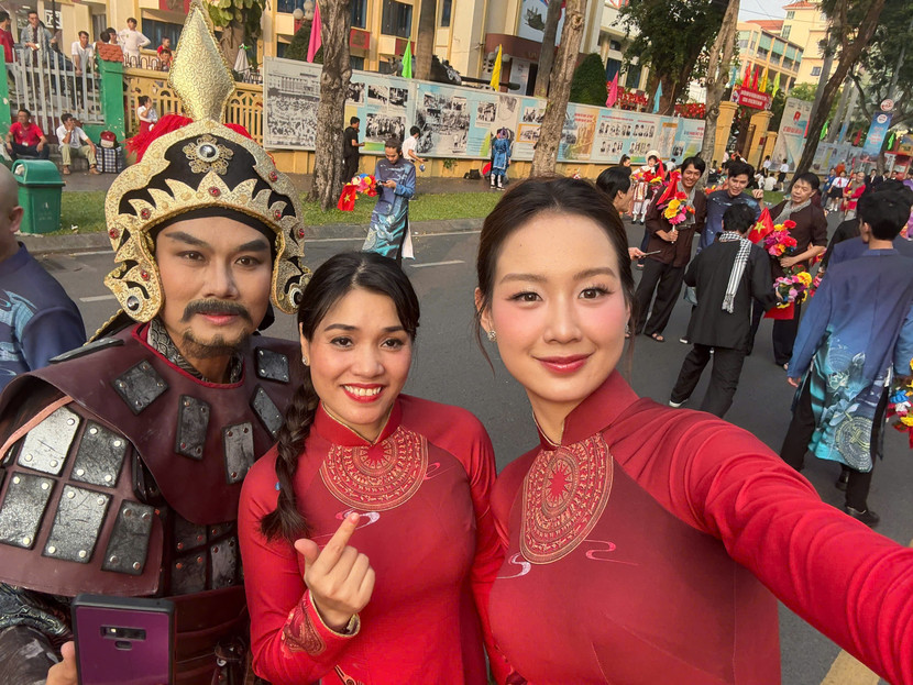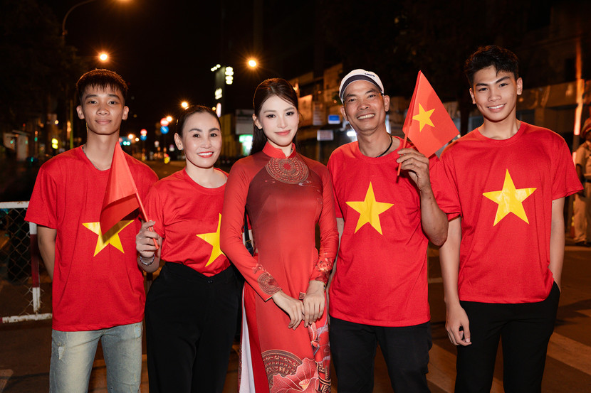 Hoa hậu Tiểu Vy mặc trang phục áo dài do Ban tổ chức chuẩn bị, xuất hiện từ sớm cùng gia đình. Cô cho biết ba mẹ và em trai đã vào TP.HCM để hưởng ứng đại lễ cũng như cổ vũ con gái tại hoạt động diễu binh diễu hành. Cả gia đình nàng hậu thể hiện tinh thần yêu nước khi khoác trên mình chiếc áo cờ đỏ sao vàng.