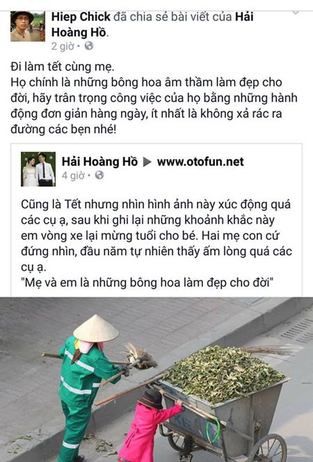 Anh Nguyễn Văn Hiệp, ở Hà Nội chia sẻ: “Em bé đi làm cùng mẹ ngày Tết, họ chính là những bông hoa âm thầm làm đẹp cho đời. Hãy trân trọng công việc của họ bằng những hành động đơn giản hàng ngày, ít nhất không xả rác ra đường các bạn nhé!”.
