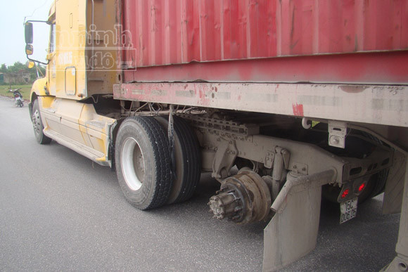 Khoảng 9h30 sáng 23-9, trên QL1A đoạn qua xã Cẩm Quang, huyện Cẩm Xuyên, Hà Tĩnh, xe ô tô tải container 15C-006.05 của CTCP vận tải Tân Thiên An (Hải Phòng) lưu thông theo hướng Bắc-Nam, bất ngờ 2 bánh xe tuột ra khỏi trục xe lăn trên đường.