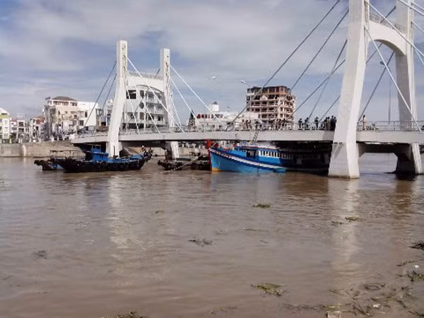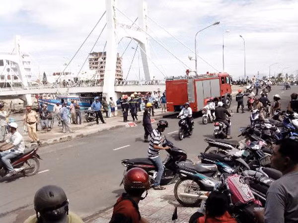 Con tàu đang mắc kẹt dưới gầm cầu