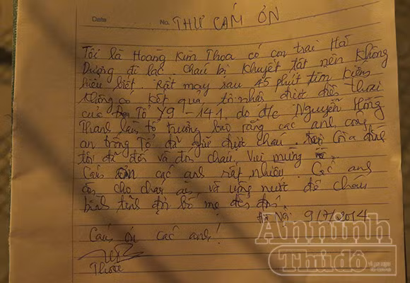 Trong khi tìm cách liên lạc với gia đình thì cháu bé được các cán bộ chiến sỹ trong tổ mua bánh và nước cho ăn uống. Có vẻ rất đói, nên cháu bé ngồi “chén” ngon lành. Vừa cho cháu ăn vừa hỏi chuyện, một chiến sỹ cảnh sát hình sự trong tổ phát hiện sợi dây trên cổ cháu có in tên Hà Dương cùng hai số điện thoại nên đã lập tức liên hệ và người đến đầu tiên là mẹ và cậu ruột của cháu bé.