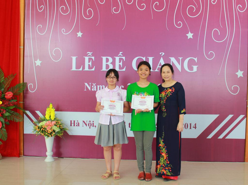Trong đó, nhà trường vinh danh 2 gương mặt tiêu biểu là Hương Giang lớp 10A1 và Khánh Chi, lớp 7A1. Hai học sinh xuất sắc này nhận được suất học bồng trị giá 10 triệu đồng vào năm học mới 2014 - 2015!