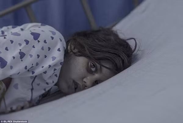 Maram, 8 tuổi đang nằm ngủ trên một chiếc giường tạm ở Amman, Jordan. Cô bé bị trúng bom lúc trên đường đi học về. Dù đã qua khỏi nhưng Maram vẫn không thể nói chuyện.