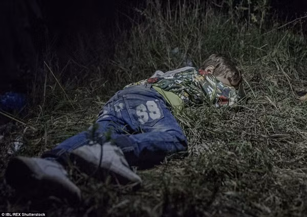 Ahmed, 6 tuổi đang ngủ trên bãi cỏ ở thành phố Horgos, Serbia. Cậu cùng người chú đã đi bộ đến châu Âu, khi cha cậu bị giết trong một cuộc không kích ở quê nhà Deir ez-Zor miền bắc Syria.