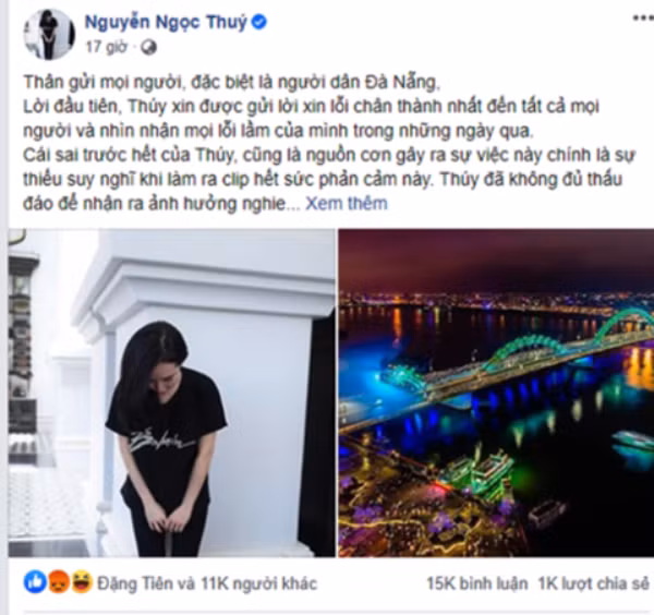 Hiện chủ tài khoản Nguyễn Ngọc Thúy đã gỡ nội dung clip và đăng tải lời xin lỗi tới mọi người và đặc biệt là người dân Đà Nẵng…