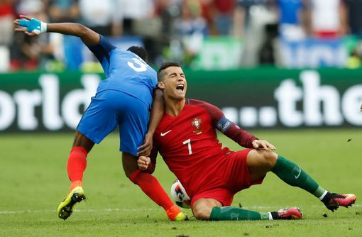 Phút 24, Ronaldo buộc phải rời sân bằng cáng vì chấn thương trong những cái ôm mặt tiếc nuối của các CĐV Bồ Đào Nha. Trước đó, anh đã có pha va chạm với Payet ở phút 13. CR7 trở lại sân sau sự chăm sóc của các bác sĩ được ít phút thì bật khóc trong đau đớn. Anh nằm vật ra sân và không thể thi đấu tiếp.