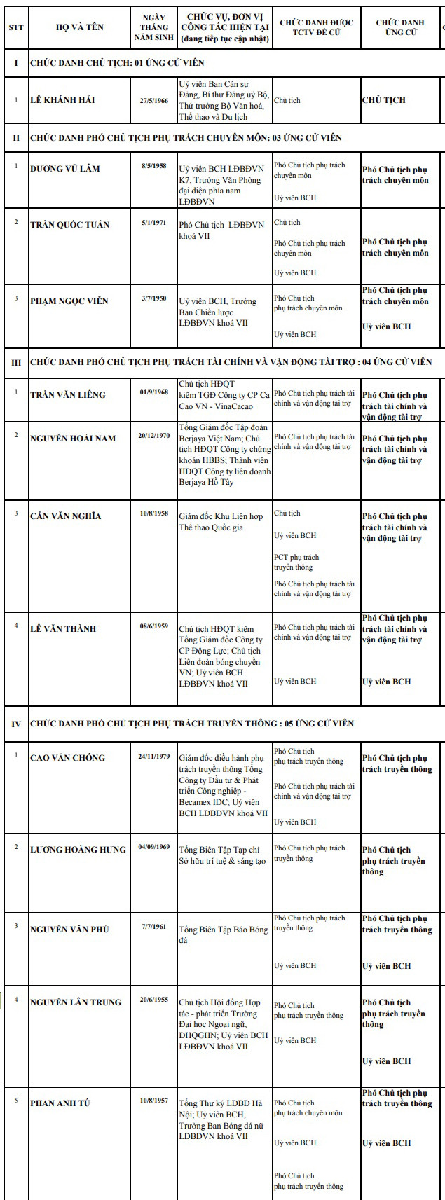 Theo bản danh sách này, vị trí Chủ tịch VFF khóa VIII có 1 ứng viên là ông Lê Khánh Hải – Thứ trưởng Bộ VH-TT&DL.