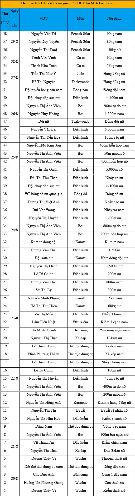 Danh sách chủ nhân 58 HCV SEA Games 29 của đoàn Thể thao Việt Nam