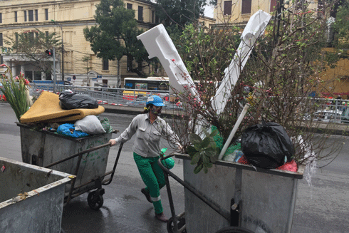 Chị Phạm Thị Na - công nhân của tổ này cho biết: “Đây chính là thứ nước chảy ra từ các loại đồ ăn thức uống mà người dân thải ra. Dọn rác trong những ngày sau Tết cực nhọc hơn ngày thường rất nhiều. Bên cạnh việc phải mất thời gian đi thu gom do tình trạng người dân đổ bừa bãi thì chủng loại rác của các ngày Tết cũng phong phú và đa dạng hơn. Sau Tết, hầu như gia đình nào cũng vứt bỏ đi các chậu quất, cành đào ra vỉa hè trong khi đây là thứ rác rất cồng kềnh khiến chúng tôi đều phải tăng thêm ca hoặc kéo dài thời gian làm việc. Đó là chưa kể số lượng rác hữu cơ cũng tăng vọt và là nguyên nhân gây ô nhiễm trên đường phố. Chỉ cần mỗi gia đình có ý thức một chút trong việc đổ rác đúng nơi quy định thì chúng tôi sẽ đỡ vất vả hơn nhiều”.