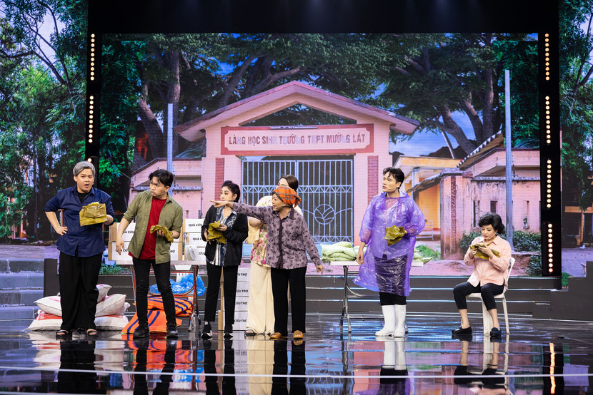 | Câu chuyện về cơn bão Yagi đổ bộ các tỉnh phía Bắc gây nên thiệt hại lớn về người và của cũng được tái hiện chân thực trên sân khấu Táo Xuân 2025. |