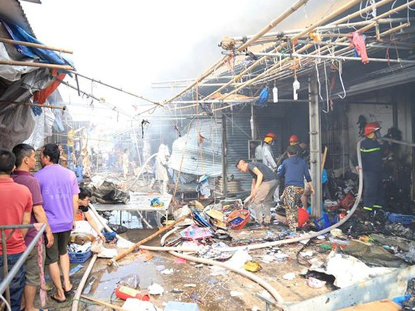 Do chất cháy chủ yếu là vải vóc, quần áo, đồ nhựa nên ngọn lửa nhanh chóng bùng phát mạnh và lan ra các ki ốt lân cận.