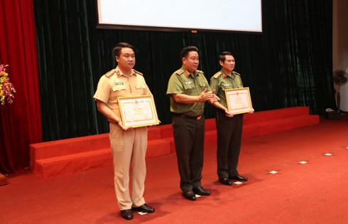 Trung tướng Bùi Văn Thành, Thứ trưởng Bộ Công an trao Bằng khen của Bộ trưởng Bộ Công an cho Phòng Tham mưu CATP Hà Nội và Đội Tuyên truyền điều tra giải quyết TNGT, Phòng CSGT CATP Hà Nội