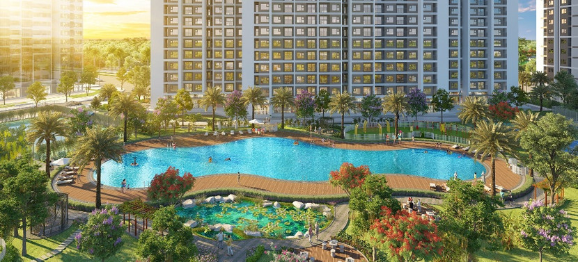 Ngay trong nội khu dự án là một bể bơi mang phong cách resort với diện tích lên tới gần 1.000m2. Thay vì theo khuôn mẫu hình chữ nhật hay oval thường thấy, bể bơi phong tại Imperia Smart City được thiết kế không gian mở rộng thoáng cùng những bờ cong uốn lượn, hai bên những hàng ghế nghỉ mát trồng đầy cây xanh mang đến cho cư dân những phút giây thư giãn, nghỉ dưỡng ngay tại nhà.