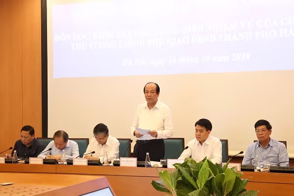 Mở đầu buổi làm việc, Bộ trưởng, Chủ nhiệm VPCP Mai Tiến Dũng, Tổ trưởng Tổ công tác của Thủ tướng chuyển lời khen ngợi của Thủ tướng về 6 vấn đề Hà Nội thực hiện nổi bật trong năm 2019.