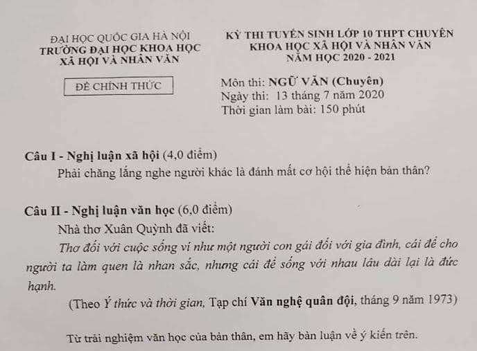 Là năm đầu tiên tuyển sinh lớp 10 chuyên Khoa học và Nhân văn của trường ĐH Khoa học Xã hội và Nhân văn, ĐHQG Hà Nội, thí sinh dự thi chuyên Văn ngày 13/7 của trường này chia sẻ đề khá khó và dài dù chỉ có 2 câu hỏi.