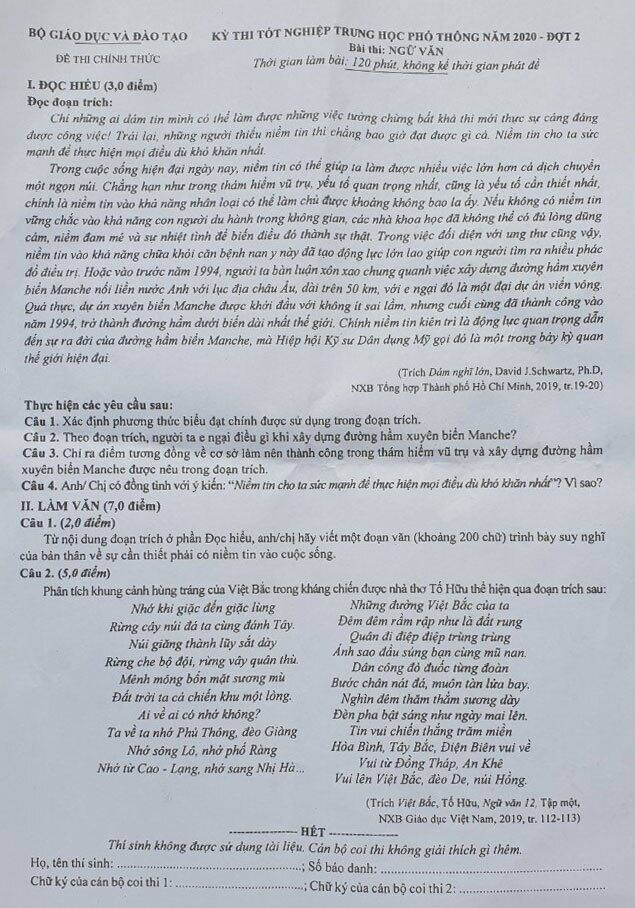 Đề thi chính thức môn Ngữ văn Kỳ thi tốt nghiệp THPT năm 2020 đợt 2 bám sát cấu trúc, mức độ, tính chất các câu hỏi như đề thi tham khảo lần 2 do Bộ GD-ĐT công bố. Từ ngữ liệu cho đến yêu cầu của các câu lệnh trong các phần Đọc hiểu,