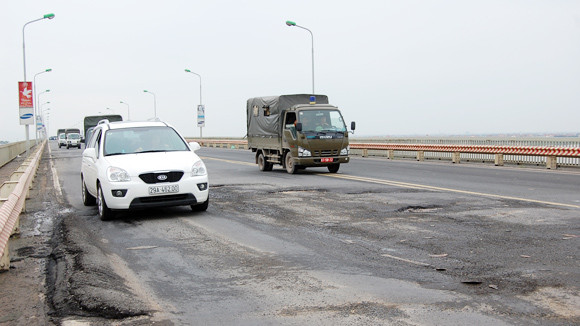 Dự án sửa chữa mặt cầu Thăng Long được khởi động và hoàn tất cách đây 2 năm, với số tiền gần 100 tỷ đồng. Tuy nhiên, sau khi đưa vào sử dụng không lâu, mặt cầu biến dạng, nứt nghiêm trọng, xuất hiện những vũng, ổ gà lớn. Dù đã qua nhiều lần thảm lại, vá víu, nhưng vẫn không che đậy được sự xuống cấp ngày càng thảm hại hơn. Bề mặt cầu hư hỏng như một chiếc áo rách vá chằng vá đụp, lộ cả sàn thép. Một số đoạn bê tông nhựa bị trôi tạo ra vết xé như những rãnh nước cắt ngang mặt cầu. Đến nay câu hỏi vẫn còn bỏ ngỏ: Sự xuống cấp nhanh chóng của mặt cầu là do trình độ hạn chế hay biết mà cứ làm?