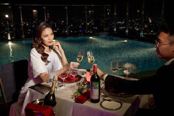 Có thể là dùng tiệc nhẹ lãng mạn tại bể bơi ở tầng 47, với tầm nhìn 360 độ bao quát toàn cảnh thành phố như Lan Khuê.