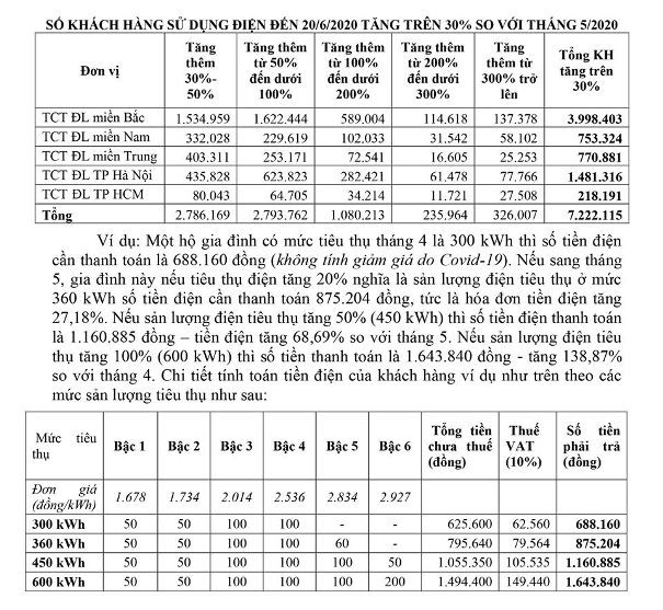 Theo số liệu thống kê mới đến ngày 20-6-2020 của EVN, đã có tới hơn 7,22 triệu khách hàng sinh hoạt (chiếm 27,77% khách hàng) có mức tiêu thụ điện cao hơn 30% so với tháng 5-2020 (gấp 2,33 lần so với tháng 5-2020).