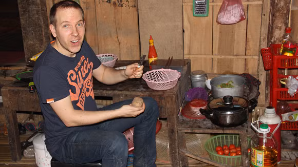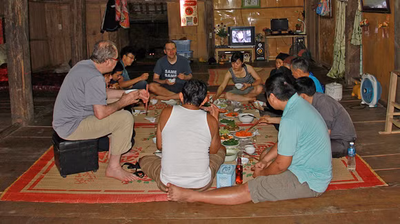 Ở đây, tôi đã gặp hai khách nước ngoài đang trải nghiệm tự nấu ăn các món ăn đặc trưng của dân tộc Tày. Họ được hướng dẫn để tự nấu ngay trên nhà sàn, tự thưởng thức những món ăn do mình nấu và uống loại rượu được ủ từ thóc là đặc sản nơi đây. Thấy tôi ngỏ ý muốn học làm một số ăn truyền thống của người Tày, bà Lô Thị Tiên, chẳng ngại ngần dạy cho tôi công thức làm hai món Thịt Lam (Nứa Lảm) và Măng quấn thịt (Mảy Nhưởng). Trong khi bà vừa hướng dẫn vừa để cho tôi cùng làm thì cô con gái của bà - Lý Thị Châm đóng vai trò phiên dịch. Đây là hai món ăn đặc trưng của người Tày thường được dùng trong những bữa cơm khách cùng với Xôi ngũ sắc, khâu nhục, thịt gác bếp, rượu thóc, rêu nướng và các loại rau rừng.