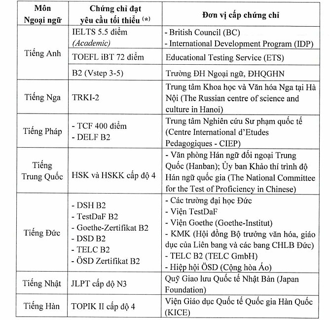 Với phương thức xét điểm thi tốt nghiệp hay học bạ, các trường có thể quy đổi chứng chỉ ngoại ngữ quốc tế thành điểm ngoại ngữ trong tổ hợp với trọng số không quá 50%, như quy định của Bộ GD-ĐT. Mức quy đổi chứng chỉ IELTS, TOEFL của 12 trường thuộc ĐHQG Hà Nội như sau: