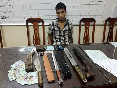 Khám xét xe taxi, lực lượng chức năng phát hiện và thu giữ một vali, bên trong chứa một khẩu súng bắn đạn hoa cải, một thanh đao, một lưỡi lê AK47, và một dao tự chế cùng các giấy tờ, vật dụng tùy thân của đối tượng.