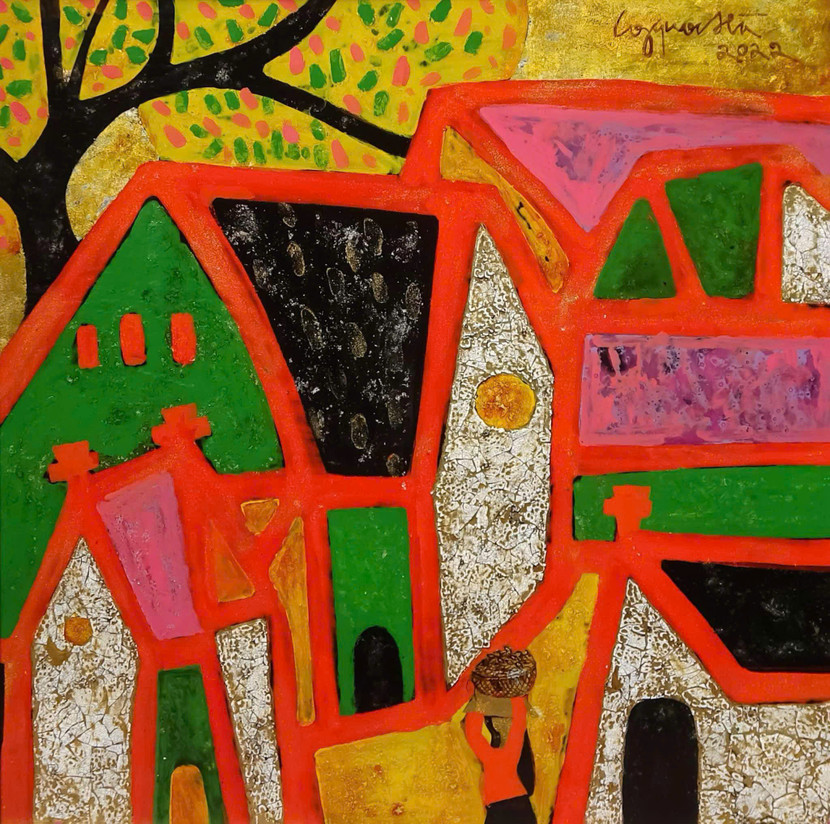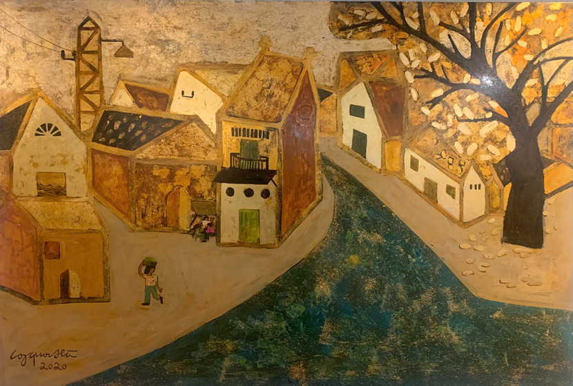 | Bức tranh sơn mài "Hà Nội tháng 7/2021" của cố họa sĩ Công Quốc Hà. |