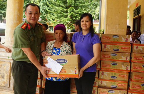 Thiếu tá Lưu Hồng Quân - Phó Tổng Biên tập Báo An ninh Thủ đô trao quà tặng bà con vùng lũ huyện Quản Bạ, Hà Giang
