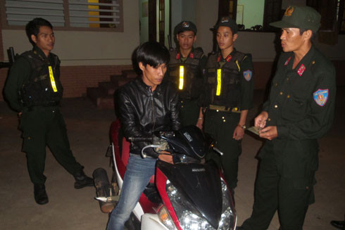 Đối tượng Trần Văn Toàn mặc áo khoác đen bị các chiến sĩ cảnh sát cơ động bắt giữ cùng chiếc xe máy tang vật