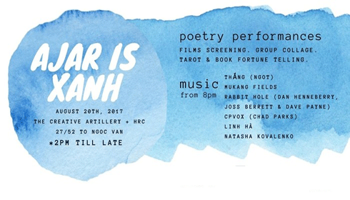 14h tại Hanoi Rock City (27/52 Tô Ngọc Vân, Tây Hồ) diễn ra Tiệc phim - thơ - nhạc AJAR IS XANH. Đây là một sự kiện cho người yêu thơ/sách, người yêu phim, những nghệ sĩ trình diễn, người yêu nhạc và người yêu-xanh-xao. Bắt đầu bằng phim, kết thúc bằng nhạc và xanh - xao - yêu - thương ở giữa.