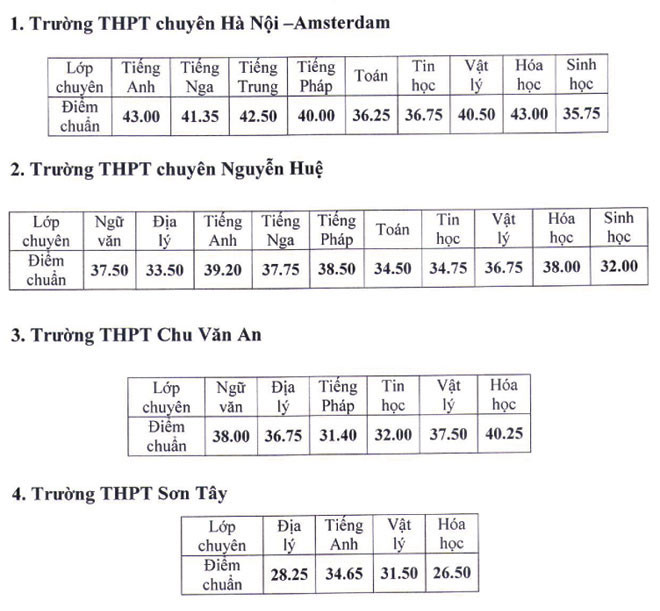 Cụ thể điểm chuẩn 35 trường công lập và 4 trường chuyên Hà Nội như sau: