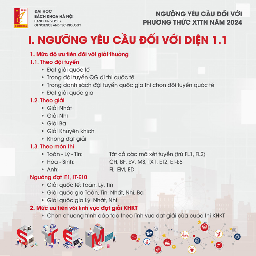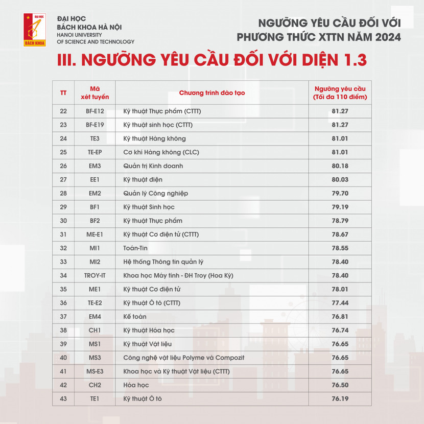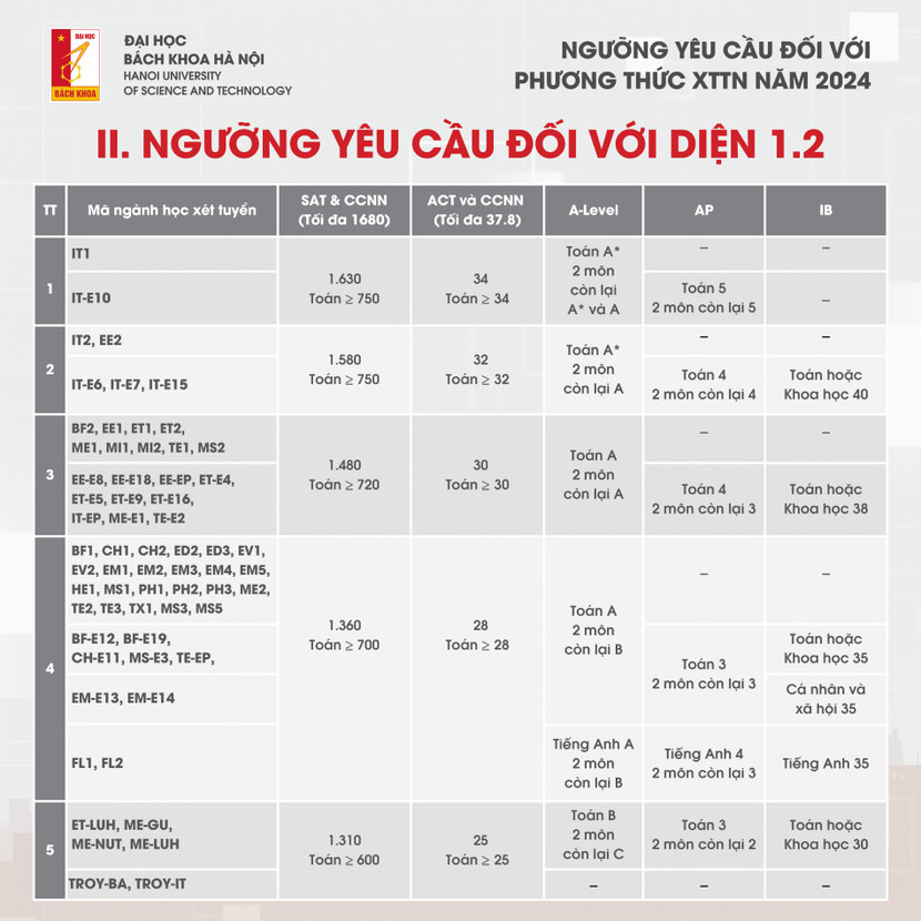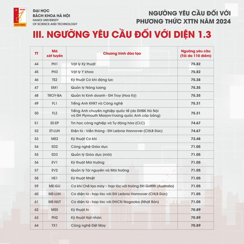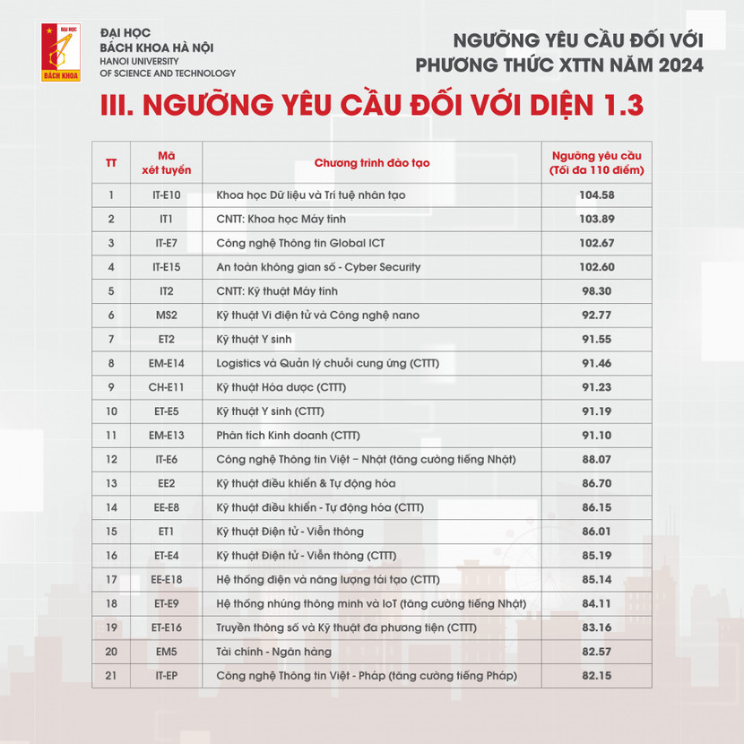 Đặc biệt, trong năm 2024 đã xuất hiện thêm một số ngành có mức điểm chuẩn cao (90+) thể hiện xu hướng về nhu cầu việc làm trong thời gian tới gồm: Nhóm ngành về Vi mạch, bán dẫn (MS2); Nhóm ngành về Khoa học và Công nghệ sức khỏe (ET2, ET-E5, CH-E11); Nhóm ngành về Logistics và phân tích kinh doanh (EM-E13, EM-E14).
