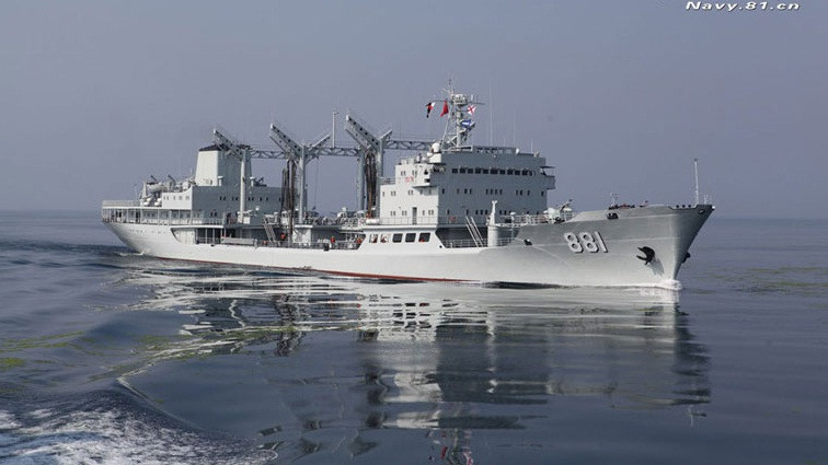 Đi cùng 6 tàu chiến đấu là tàu hậu cần Hồng Trạch Hồ (881) có lượng giãn nước tới hơn 21.000 tấn.