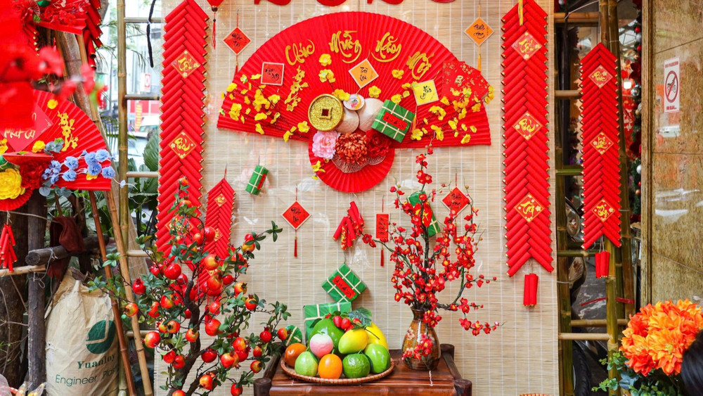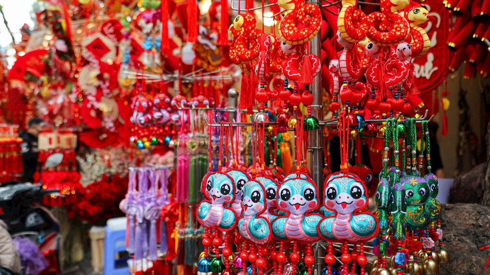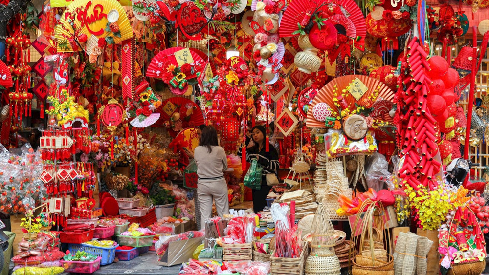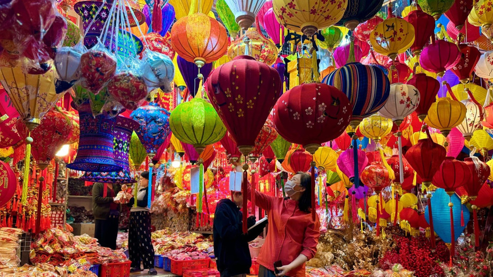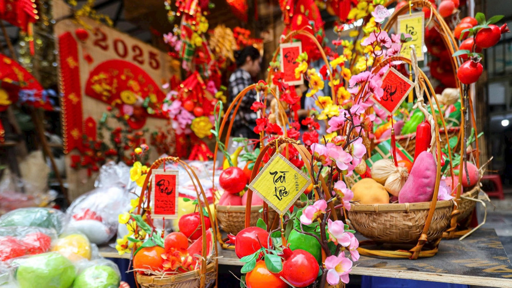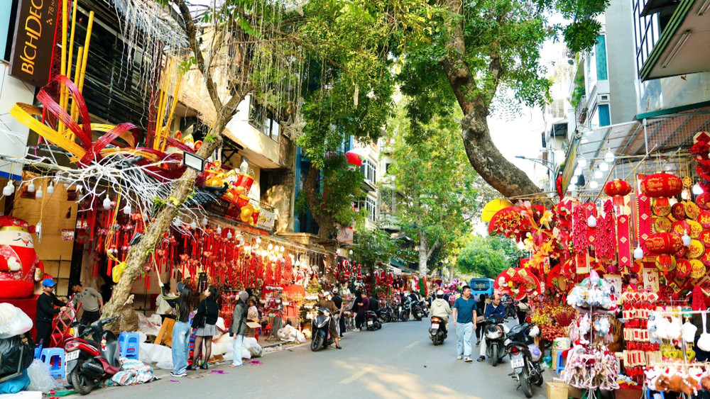 ANTD.VN - Không khí Tết đang đến rất gần, trên con phố Hàng Mã (Hoàn Kiếm, Hà Nội) đã khoác lên mình tấm áo rực rỡ nhiều màu để chào đón năm mới. Sắc xanh, sắc đỏ của những bánh chưng, hoa đào, đèn lồng, câu đối, đồ trang trí rực rỡ tràn ngập không gian, hòa cùng dòng người tấp nập mua sắm, tạo nên khung cảnh náo nhiệt, mang đậm hương sắc mùa Xuân của Thủ đô.