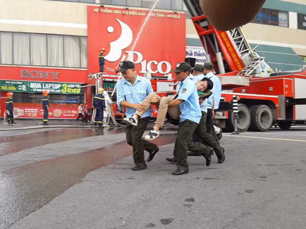 Các đội hình chữa cháy, tìm kiếm cứu nạn nhanh chóng triển khai các mũi tiếp cận thang bộ, xe thang, thang cầu dây nghiêng để cứu người mắc kẹt, đưa đến nơi an toàn.