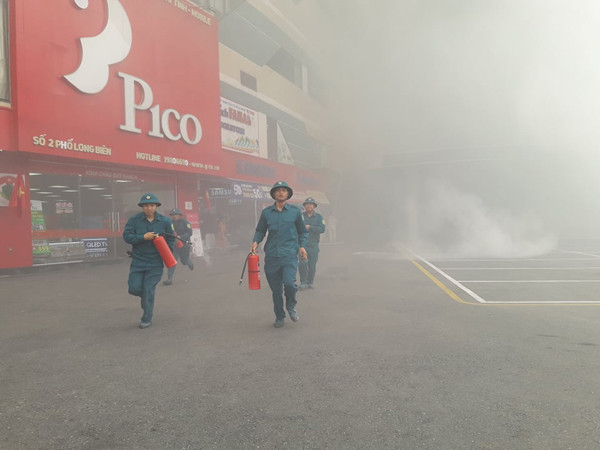 Sau đó, CAQ Long Biên đã huy động các lực lượng chữa cháy cơ sở và trong khu vực đến làm nhiệm vụ. Công tác chữa cháy ban đầu được triển khai nhanh chóng, nhân viên tòa nhà hướng dẫn cư dân đến nơi an toàn. Trong khi xảy cháy, có nhiều người hoảng loạn đã chạy ngược lên tầng cao của trung tâm thương mại, đứng báo hiệu cứu nạn.