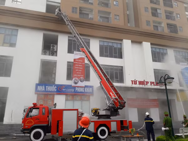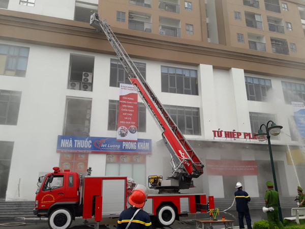 Sáng 26-8, lực lượng Cảnh sát PCCC và CNCH - Công an huyện Thanh Trì và UBND huyện Thanh Trì, Hà Nội phối hợp tổ chức diễn tập phương án chữa cháy và cứu nạn, cứu hộ tại chung cư Tứ Hiệp Plaza thuộc xã Tứ Hiệp, huyện Thanh Trì.