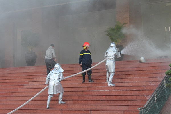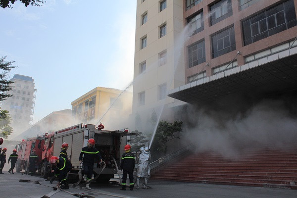 Tình huống giả định là đám cháy bất ngờ bùng phát từ phòng họp tại tầng 3 của tòa A do sự cố chập điện, khi bảo dưỡng hệ thống điện. Hệ thống báo cháy tự động đã báo động cho cán bộ, nhân viên di chuyển khỏi toà nhà.
