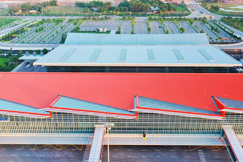 Biểu tượng cánh buồm còn được thể hiện sắc nét trong hình ảnh mái vòm nhà ga. Từ xa nhìn lại, mái vòm nhà ga được thiết kế theo nhiều khối, với những mũi nhô đặt trên nền đỏ thắm như những cánh buồm nối tiếp nhau vươn ra biển lớn. Thiết kế mái che độc đáo này còn tạo khoảng trống đón ánh sáng tự nhiên và gió, giúp tiết kiệm năng lượng.
