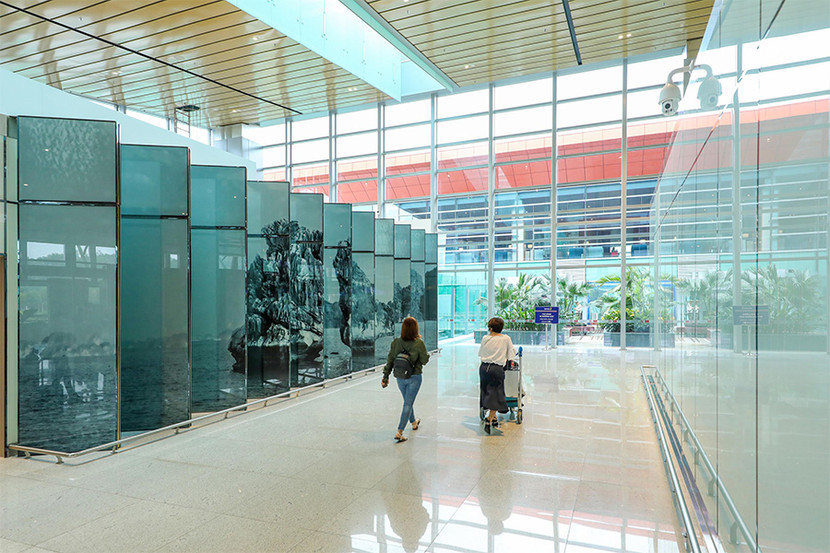 Bên cạnh đó, dấu ấn của vịnh Di sản cũng được đội ngũ kiến trúc sư đưa vào không gian nội thất của nhà ga với những bức bình phong lớn đặc tả khung cảnh Hạ Long, đặt ngay tại lối đi vào phòng chờ quốc nội và quốc tế. Đây cũng là điểm check in thú vị của nhiều hành khách, khi đến với sân bay quốc tế Vân Đồn.