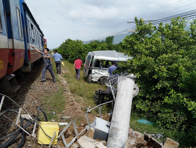 Hiện trường vụ tai nạn tàu hỏa đâm ô tô khách 16 chỗ ngồi làm 3 người chết ở Bình Thuận