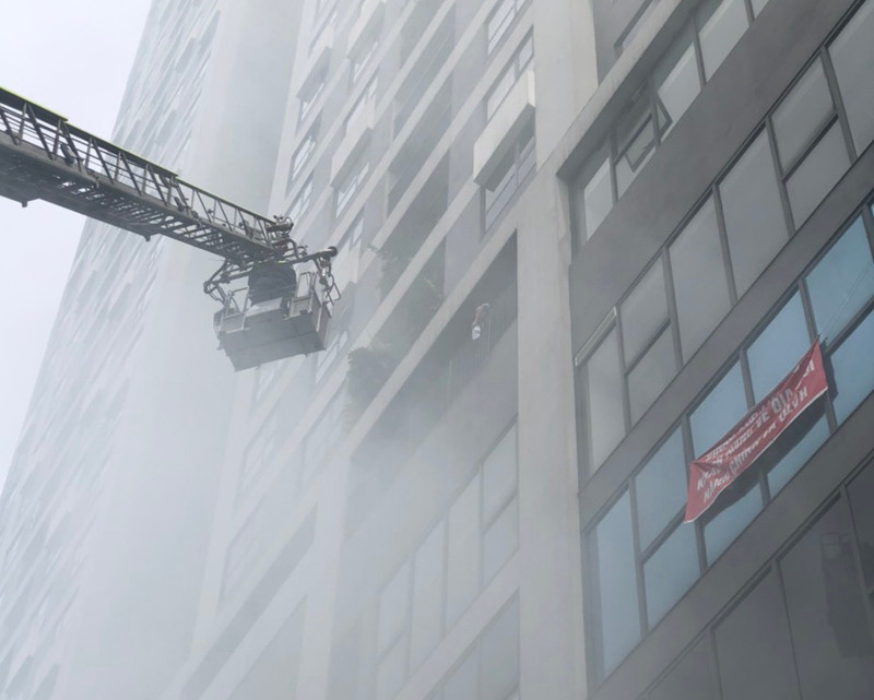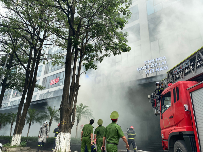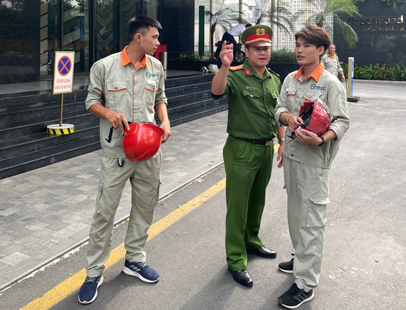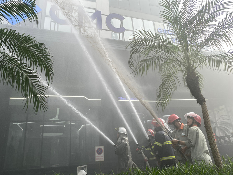 ANTD.VN - Giả định tình huống cháy tại khu vực thương mại, dịch vụ tầng 3 của Tòa nhà Dreanmland Plaza tại quận Nam Từ Liêm. Do trong cơ sở có các chất cháy như vải, nhựa, gỗ,... đám cháy phát triển nhanh chóng gây nguy hiểm cho người bị mắc kẹt.