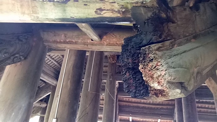 Tại vị trí một số đầu cột sát mái, nước thấm sâu vào trong thớ gỗ, gây mục, mủn các mộng, hệ thống cột kèo bị mối mọt lại phải dầm mưa dãi nắng khiến cho kết cấu yếu. Bên cạnh đó, hệ thống xà, rường của đình cũng bị mục ruỗng rất nặng nề, vì vậy khi gặp nước các kết cấu gỗ càng nhanh mủn…