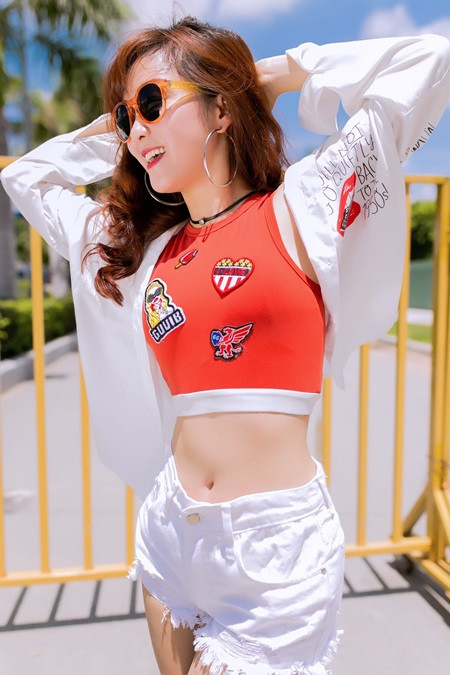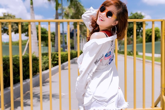 Không khí mùa hè được tô điểm mạnh mẽ hơn với sắc cam và đỏ nổi bật dưới ánh nắng. Thời tiết này, kính mắt chắc chắn là thứ phụ kiện bạn không thể bỏ qua, vừa giúp bảo vệ “cửa sổ tâm hồn”, vừa khiến bạn trở nên thời trang và hiện đại hơn. Cùng với đó, crop-top hay jeans cạp cao cũng là trang phục chiếm phần lớn trong tủ đồ mùa nóng của Đinh Hương.