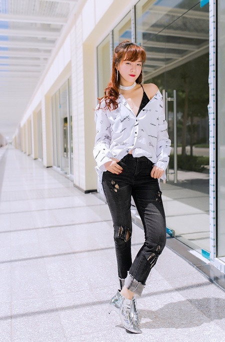 Trong bộ ảnh street style mới nhất, Đinh Hương xuất hiện với diện mạo trẻ trung, năng động với sơmi trễ vai cùng quần jeans rách gối chưa bao giờ mất đi vị trí độc tôn trong tủ đồ của giới trẻ. Kết hợp cùng đó là đôi boots "tông xuyệt tông" với phụ kiện chocker ánh kim nổi bật.