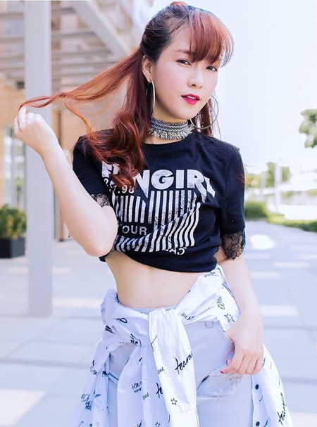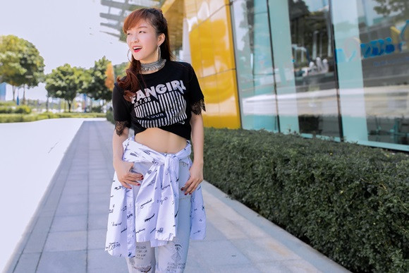 Bộ trang phục thứ 2, áo sơmi một lần nữa được tận dụng bằng cách thắt hờ hững phần eo. Chiếc croptop đen cá tính giúp Đinh Hương khoe khéo vòng eo thon gọn. Không thể không nhắc tới quần jeans in slogan - item đang là hot trend khiến các bạn trẻ lùng sục suốt thời gian qua